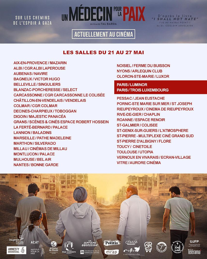 pour la diffusion du film "Un Médecin pour la Paix : D'après le livre "I SHALL NOT HATE" ("JE NE HAÏRAI POINT") du Dr IZZELDIN ABUELAISH Un film essentiel dans le contexte actuel par son puissant témoignage de tolérance, de courage, d'espoir et de résilience à travers lhistoire bouleversante du Dr Izzeldin Abuelaish, un homme exceptionnel nominé 5 fois au Prix Nobel de la Paix. ![]() |
