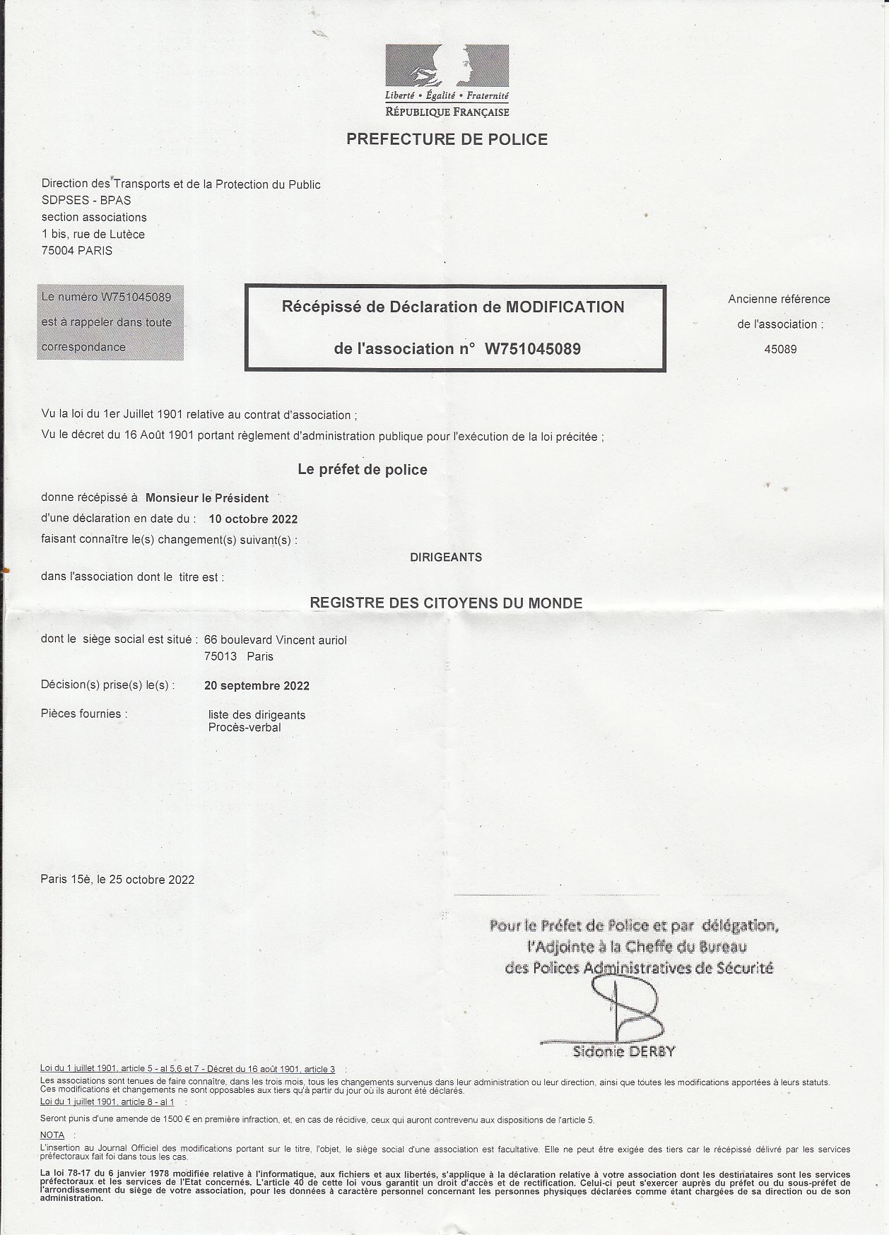 Le Conseil d'Administration du Registre des Citoyens du Monde (association française loi-1901) est juridiquement responsable :