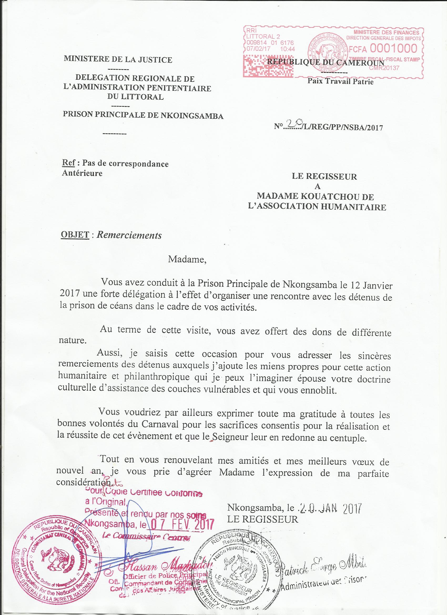 Don de vêtements à la prison de Nkongsamba (Cameroun) Nouvelle et action humanitaire le Jeudi 12 Janvier 2017 L'association humanitaire dans son programme d'action citoyenne et solidaire a fait un don de vêtements à la prison principale de Nkongsamba en présence du Régisseur Serge Patrick Mbita administrateur de prisons, du chargé d'action sociale et culturelle, le personnel présent de l'administration pénitentiaire. Dans cette délégation de faite, les membres de l'association humanitaire, Maître Meyoupa Dagobert juriste présent pour lévénement ont rappelé la mouvance de l'éducation à la citoyenneté mondiale au sein de la prison. Les autres membres MM Honoré Gobert Tcheumté du haut commissariat d'intervention générale à Douala et Paho Edgard de Juliot de la Commission nationale des droits de l'homme pour la région du Littoral ont porté leurs soutiens pour la réalisation Le contenu du don va de suivre: