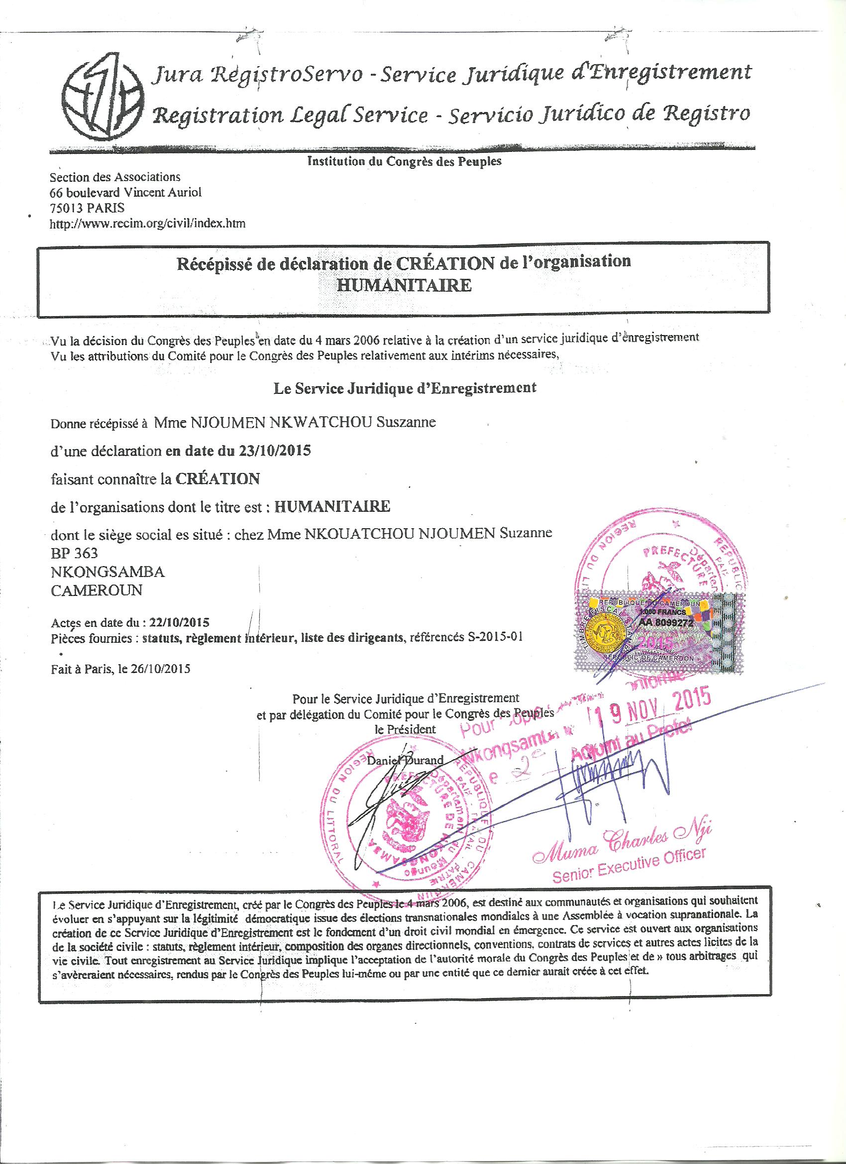 Association Humanitaire Adresse B.P 363, NKONGSAMBA KAMERUNIO HUMANITAIRE Procès-verbal de l'assemblée générale constitutive du 7Janvier 2016 En date du 7 Janvier 2016 à 11heures, les fondateurs de l'association Humanitaire se sont réunis en assemblée générale constitutive au domicile de la Présidente, siège social de l'association au village EDIP 1005eme Territoire citoyen du monde Se Sont Présentés :