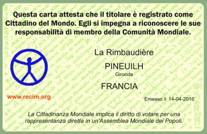 Il REGISTRO DEI CITTADINI DEL MONDO (66 Boulevard Vincent Auriol, 75013 PARIS) è un Organizzazione Non Governativa. Come tutti i documenti rilasciati da una ONG, la carta di Cittadino del Mondo non è riconosciuta dagli Stati nazionali, e non dispensa in alcun modo dal disporre regolarmente di documenti ufficiali quali la carta didentità nazionale, il passaporto, il permesso di soggiorno, la carta di lavoro, etc. La carta di Cittadino del Mondo simboleggia lappartenenza naturale alla comunità mondiale, ma anche la volontà di vedere un giorno i problemi comuni a tutta lumanità attraverso il diritto e le leggi emanate dalla democrazia mondiale. Disporre di questa carta, mostrarla agli amici, ed ai conoscenti costituisce una reiterata dichiarazione che il mondo non ha completato la sua piena realizzazione, che non è ancora unito e che i diritti umani non vi sono ancora garantiti a tutti. |