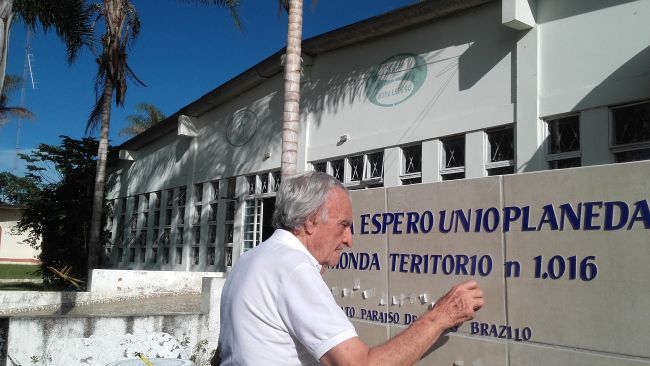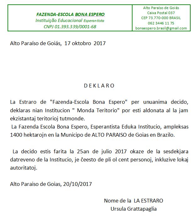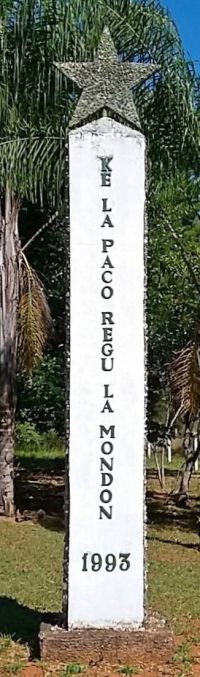 Inauguration de la stèle de mondialisation à l'école Bona Espero (Brésil). Le 25 juillet 2017, l''école domaniale "Bona Espero", située à Alto Paraiso (Goias), se déclarait "territoire mondial lié à la communauté mondiale. Cette mondialisation est la 1016ème enregistrée. Ce dimanche 18 novembre 2018, y sera inaugurée près de l'entrée du bâtiment principal une stèle qui rappellera cet engagement, au moment même où , à Paris, on célèbrera les 70 ans de la citoyenneté mondiale. Selon un message en date du 12 novembre, la stèle était en voie de finition. "D'un côté en portugais, de l'autre côté en Esperanto, on y lira le titre et les noms de 20 villes symboliques avec les distances qui les séparent de Alto Paraiso : Hiroshima à 17552 km, Paris à 8541 km, etc. Dans le mur ont été gravés les noms des 77 personnes qui ont signé la déclaration de mondialisation de notre école domaniale (1.400 hectares) et approuvé la création de ce monument symbolique du fait que la terre est unique et qu'elle est pour nous tous. Ensuite nous essaierons de réaliser le même monument dans la ville de Alto Paraiso, qui compte 8000 habitants. Nous vous adressons nos voeux de courage et de force pour que la commémoration soit réussie et fasse prendre conscience de la nécessité de la citoyenneté mondiale." Bien amicalement. (signé) Giuseppe et Ursula Grattapaglia. ![]()